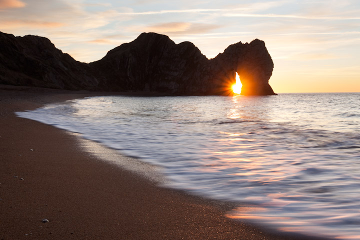 Durdle Door on Dorset’s Jurassic coast is all that remains of a long rib of limestone that once ran parallel to the shore, a landform known as a concordant coastline. The horizontally laid down rocks have been folded upwards into a nearly vertical alignment by earth movements. Where a joint between these layers is weaker wave-action has opened up a sizeable archway. This location marks a boundary between Jurassic Portland Limestone and chalk from the subsequent Cretaceous period.